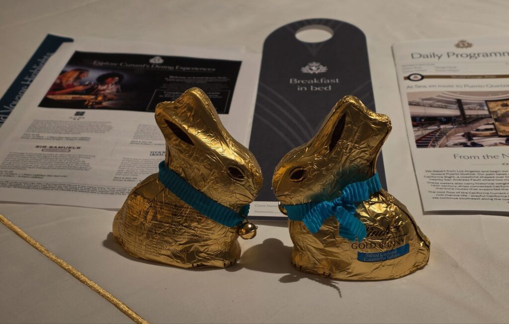 After a quick duck into the Commodore Club for a night cap and a “hello” to some familiar faces from the evening’s happy hour, it was time to call it a night. It being Easter Sunday, these little guys were waiting for us when we got back to our room.