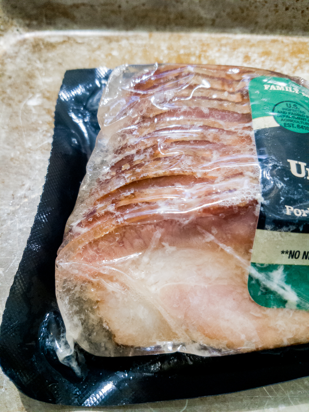 The one intangible ingredient you need is time. With the Joule set at 147F/64C, this takes as "little" as 9 all the way to 48 hours depending on how tender you want it in the end (and how long you want to wait). So some advanced planning is required here. Once the bath is up to the set temperature, just through in the whole vacuum sealed package the bacon come from the store in. And wait....or just go to bed and try to sleep in the next morning even knowing that bacon is waiting for you.