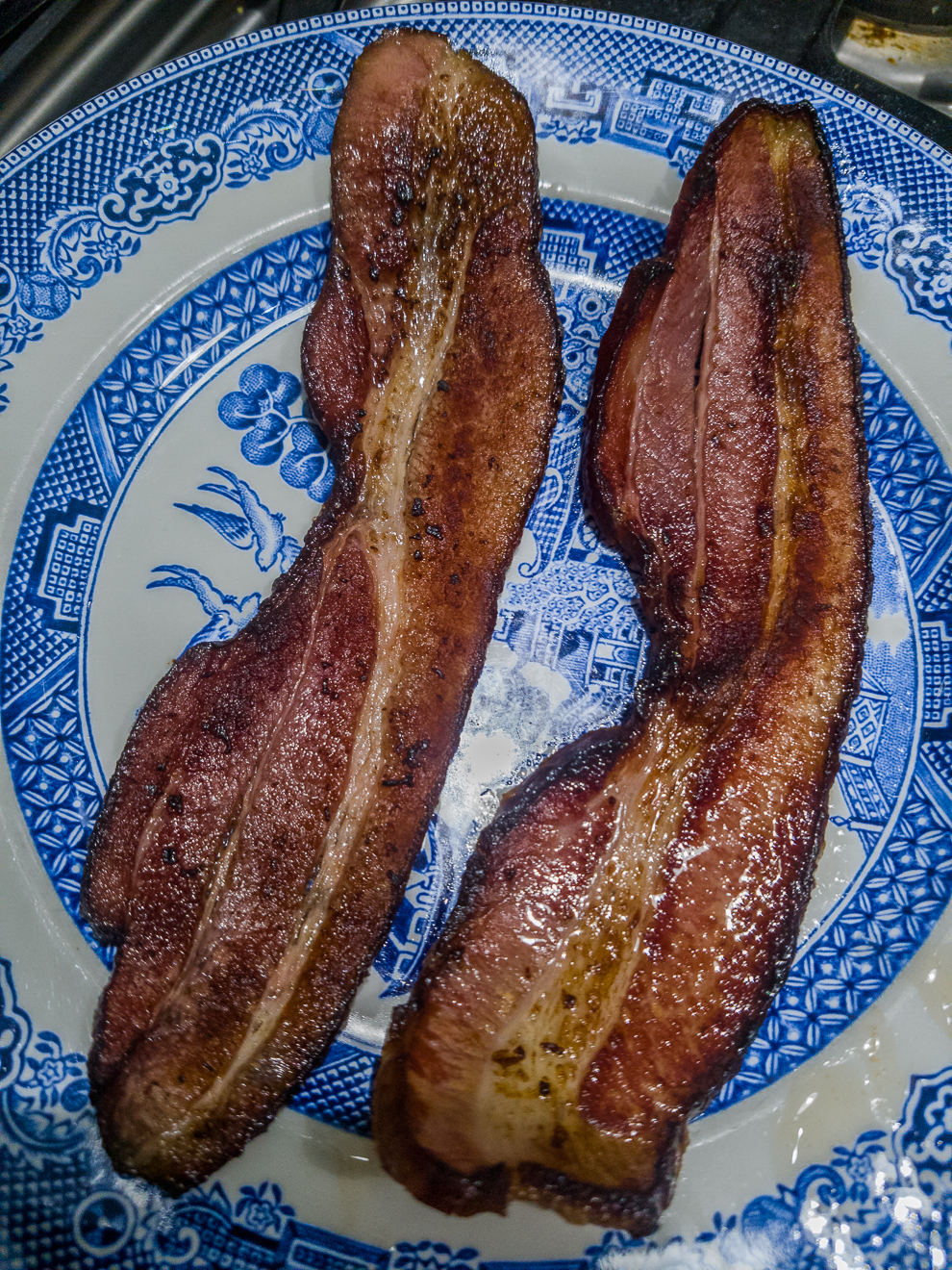 In the morning, it couldn't be easier. Just get out your trusty cast iron skillet or carbon steel pan or any pan, really, that can get smokin' hot. Don't use a Teflon pan, it won't like this much heat. When the pan is good and hot, throw on a few strips and let them sizzle for only 30 seconds. Chef Steps suggests just doing one side. We like it better with both sides seared. Just remember it only needs 30 seconds on each side since it is technically fully cooked already. You're just crisping it up a bit. Serve immediately!