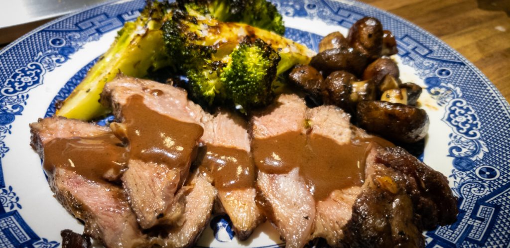 Add a couple of your favorite veggies to the platter, and pour on a little of that sauce you made over the meat.